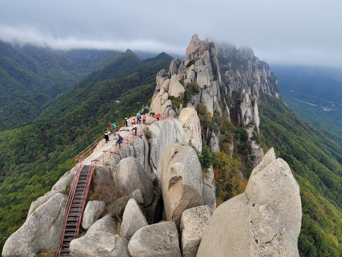 설악동 소공원 안의 깎아지른 듯한 돌산 800m 위 80칸의 넓은 돌바닥 둘레에 쌓은 2,100m의 산성이 권금성입니다. 산성을 만든 연대는 확실한 기록이 없어 알기 어렵습니다. 다만, 신라시대에 권씨와 김씨 두 장사가 난을 피하기 위해 쌓았다 하여 권금성이라고 합니다. 이곳에 오르면 외설악의 절경과 동해의 끝없는 바다가 펼쳐져 보여 장관을 이룹니다.