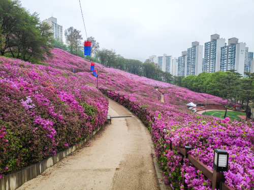 군포의 봄을 대표하는 철쭉동산은 4월 말부터 5월 초까지 봄꽃으로 유명한 곳입니다. 대량으로 식재된 철쭉은 하늘을 덮을 만큼 아름다운 풍경을 선사합니다. 철쭉동산에서는 철쭉을 감상하며 자연을 만끽할 수 있습니다.