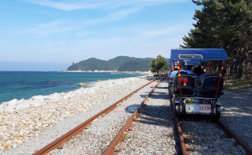 곰솔과 기암괴석으로 어우러진 삼척을 지나는 국내 유일의 삼척 해양레일바이크는 아름다운 동해의 해안선을 따라 5.4km 복선으로 운행되고 있습니다. 이곳에서 레이저 쇼가 연출되는 환상의 터널을 들어가면 신비로운 해저터널을 여행한 듯한 경험을 누릴 수 있습니다.