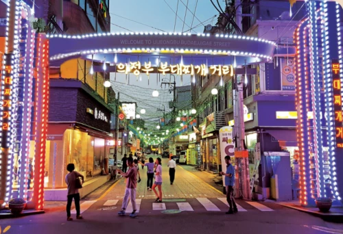 부대찌개 거리는 의정부의 맛의 중심지입니다. 이 장소는 군인들이 아닌 미군부대 주변 지역에서 시작된 음식문화의 중심지로 얼큰하고 시원한 부대찌개를 즐길 수 있습니다.